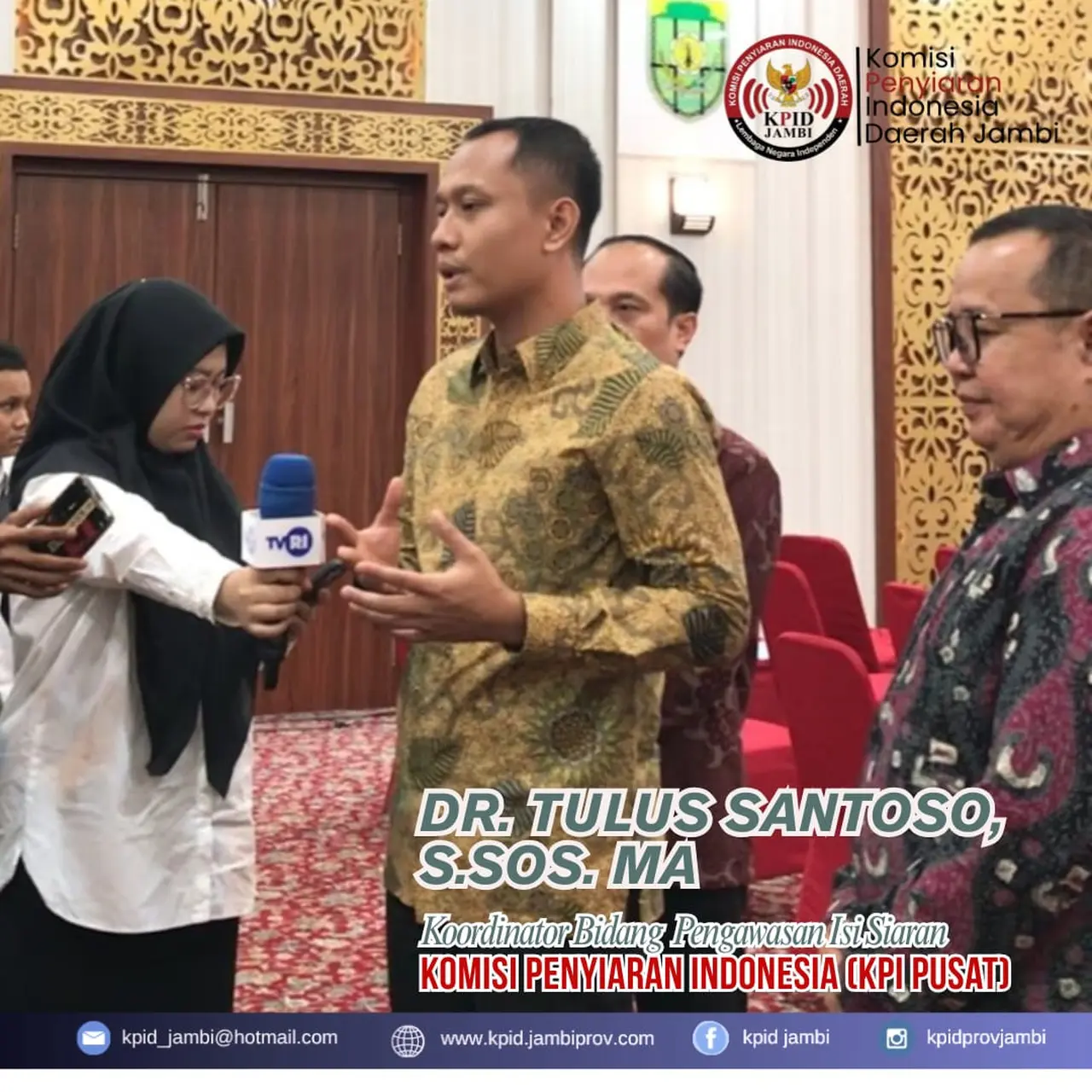 Komisi Penyiaran Indonesia Daerah (KPID) Provinsi Jambi menyelenggarakan kegiatan Sosialisasi Pedoman Perilaku Penyiaran dan Standar Program Siaran (P3SPS). Acara ini dihadiri langsung oleh perwakilan KPI Pusat, Asisten I Gubernur Jambi, Ketua DPRD Provinsi Jambi, serta Dinas Komunikasi dan Informatika Provinsi Jambi.