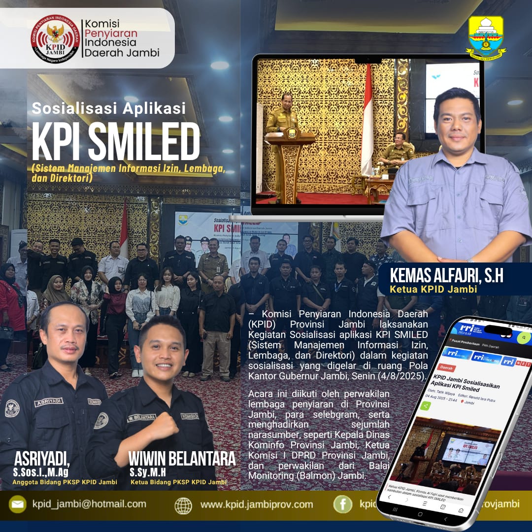 Ketua KPID Jambi, Kemas Al Fajri menjelaskan bahwa KPI SMILED merupakan inovasi sistem digital yang dirancang untuk mempermudah pengelolaan data perizinan dan direktori lembaga penyiaran secara terpusat. “Keberadaan KPI SMILED menjadi solusi atas berbagai persoalan perizinan lembaga penyiaran yang kerap kami terima,” ujarnya.